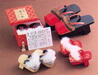 雪下駄 一本歯のげた。二本歯のように雪が歯に食い込まない。爪革が防水と防寒を兼ねる。民芸品として『ミニ雪下駄』もつくっている。 |