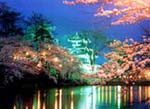 高田公園の桜は明治42年、13師団の設置を記念して在郷軍人会によって2,200本の桜を植えたのが始まりで、現在公園内には約4,000本ある。三重櫓と桜がぼんぼりの明かりに映え、お堀の水面にうつる様は日本三大夜景の一つといわれ、華やかさにつつまれる。 春を待ちかねた市民はもとより、期間中各地から花見に訪れる人たちで賑わう。 |